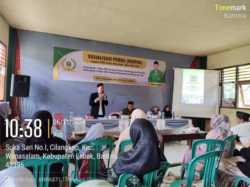 Lebak, Kabarreformasi.com – Anggota DPRD Banten Musa Weliansyah mengadakan sosialisasi dua peraturan daerah (Perda) penting, yaitu Perda Nomor 1 Tahun 2022 tentang Fasilitas Penyelenggaraan Pesantren dan Perda Nomor 9 Tahun 2014 tentang Perlindungan Perempuan dan Anak. Acara ini berlangsung di CSG Desa Cilangkap, Kecamatan Wanasalam. Rabu (6/11/2024).