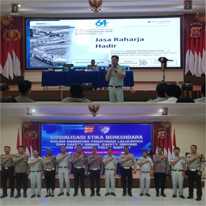Serang – Dalam upaya mendukung terciptanya keamanan, keselamatan, kenyamanan, dan kelancaran berlalu lintas (Kamseltibcarlantas), Jasa Raharja bekerja sama dengan Polda Banten menyelenggarakan kegiatan Sosialisasi Etika Berkendara dan Safety Riding, Safety Driving. Kegiatan ini bertujuan untuk meningkatkan pengetahuan dan keterampilan personel dalam mengemudikan kendaraan bermotor secara aman dan bertanggung jawab.