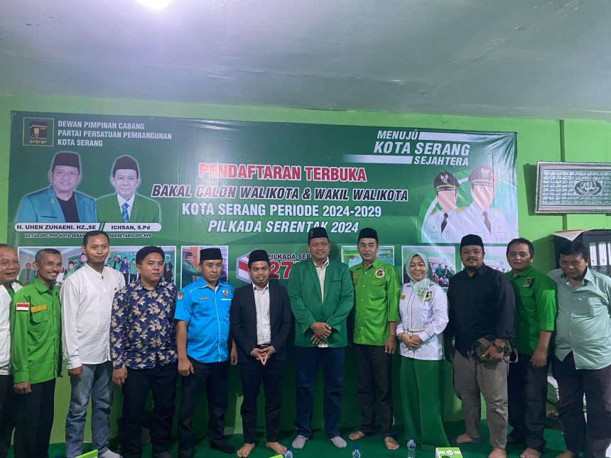 Serang, Kabarreformasi.com – Bakal calon Walikota Serang Ahmad Jayani dikawal oleh timnya saat mengembalikan formulir pendaftaran di Kantor DPC Partai Persatuan Pembangunan Kota Serang, Selasa 16/05/2024.