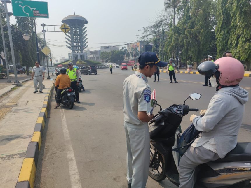 Cilegon – Tim pembina SAMSAT Cilegon dari unsur Kepolisian, Jasa Raharja dan Bapenda UPT PPD Cilegon kembali melakukan Penertiban Pajak Kendaraan Bermotor sebagai upaya meningkatkan kesadaran Masyarakat terhadap kewajiban membayar Pajak Kendaraan Bermotor (PKB) dan Sumbangan Wajib Dana Kecelakaan Lalulintas Jalan (SWDKLLJ) khususnya bagi warga Kota Cilegon, Gelaran Operasi Gabungan dilaksanakan di dekat Tugu Landmark Cilegon , tepatnya jalan Jendral Surdirman Kel. Ramanuju Kec. Purwakarta Kota Cilegon, Sabtu (21/10/2023).