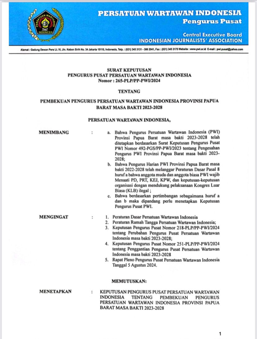 Seperti diketahui Pengurus PWI Pusat telah mengeluarkan SK dengan Nomor : 265-PLP/PP-PWI/2024 tentang pembekuan pengurus PWI Provinsi Papua Barat 2023-2028.