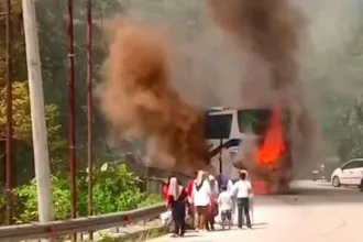 Hendak ke Bukit Kubu,Bus Pariwisata Hangus Terbakar di Bandar Baru